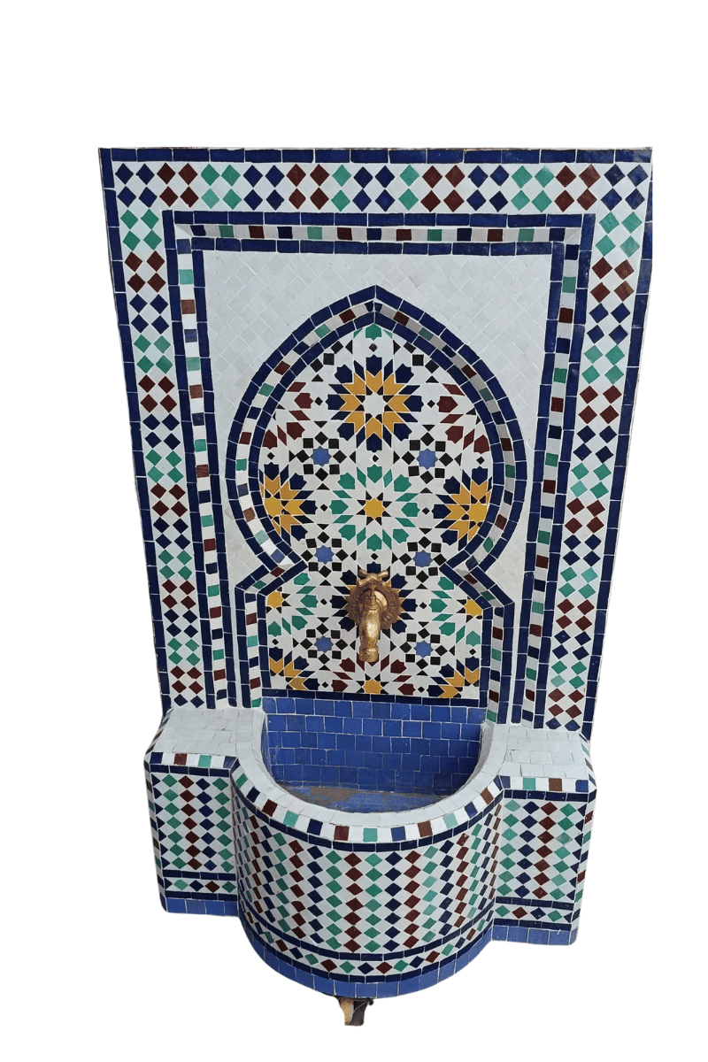 Le bassin semi‑circulaire carrelé bleu et la robinetterie en laiton forment un ensemble harmonieux, prêt à l’installation contre un mur stable �.Points fortsMotifs traditionnels en tesselles multicolores offrant une identité artisanale forte. �Robinet en laiton au fini chaleureux, facile à intégrer à des décors naturels. �Bassin frontal arrondi pour une collecte d’eau pratique et une silhouette élégante. �Format 130 × 80 cm qui s’adapte aisément aux espaces résidentiels ou commerciaux. �CaractéristiquesDimensions: hauteur 130 cm × largeur 80 cm (mesures fournies). �Finition: mosaïque céramique multicolore avec frises géométriques et arc central. �Robinetterie: laiton, position.