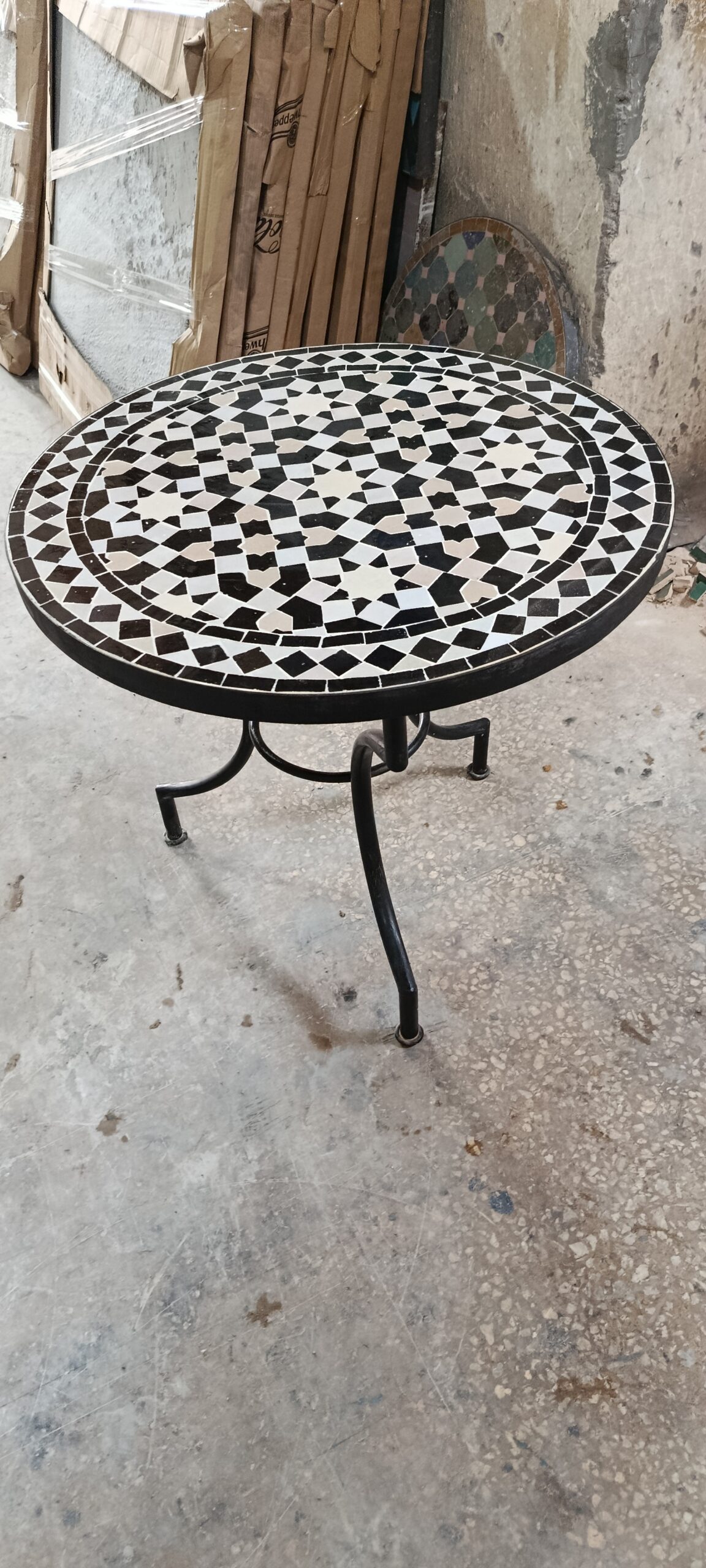 Cette table ronde présente un plateau en mosaïque au motif géométrique beige et noir sur un piètement en métal noir à trois branches pour un style bistrot raffiné. ��