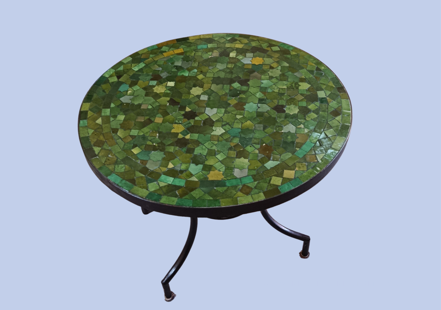 Plateau en mosaïque de zellige vert aux nuances profondes, posé en petit calepinage régulier pour un rendu élégant et lumineux. � Bordure et chant métalliques noirs, avec piètement en fer forgé à trois pieds et anneau central, assurant stabilité et style. �MatériauxZellige émaillé vert, taillé et assemblé manuellement pour un rendu authentique et durable. � Structure en fer forgé noir, adaptée à un usage intérieur ou extérieur abrité. �